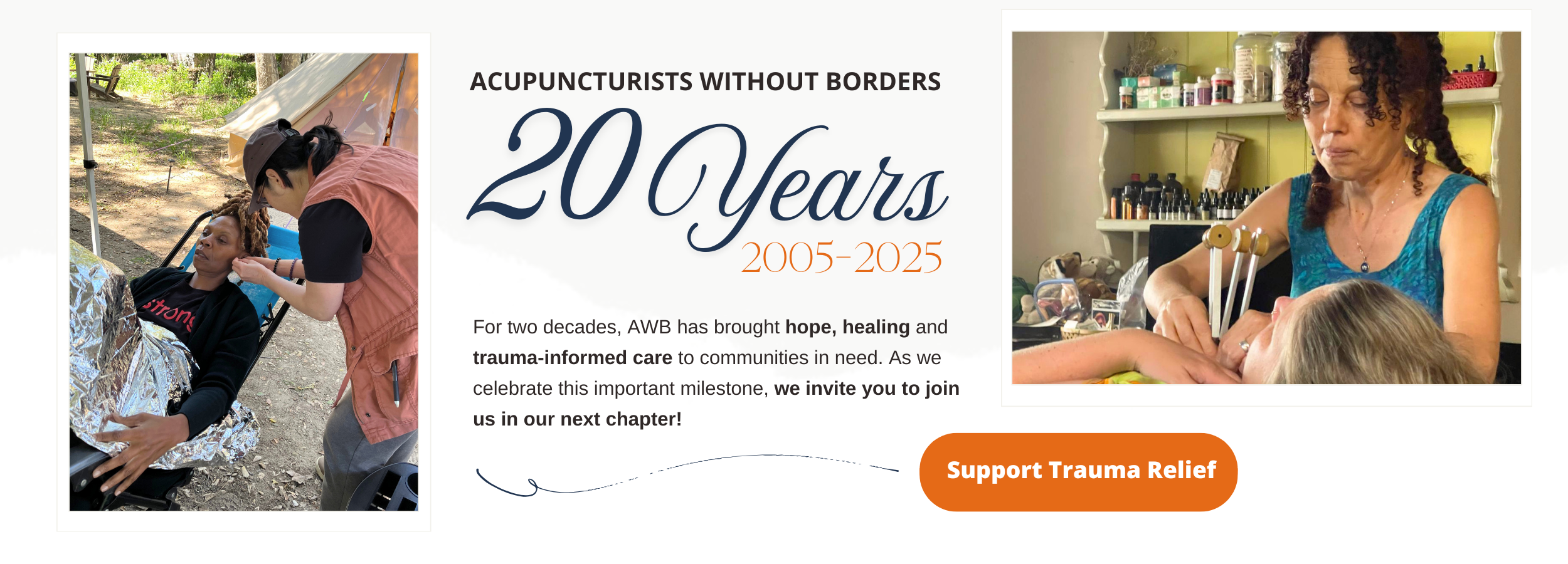 Acupuncturists Without Borders (AWB) provides integrative, trauma-informed care to people who have experienced physical and emotional trauma, using therapies such as acupuncture, therapeutic massage, and plant-based medicine. To increase the impact of AWB’s trauma-healing work, we train volunteer acupuncturists, physicians, nurses, midwives and other health professionals to create sustainable, collaborative programs in their own communities.